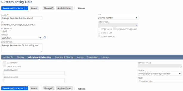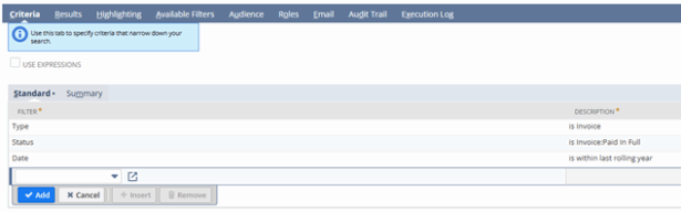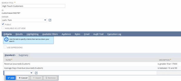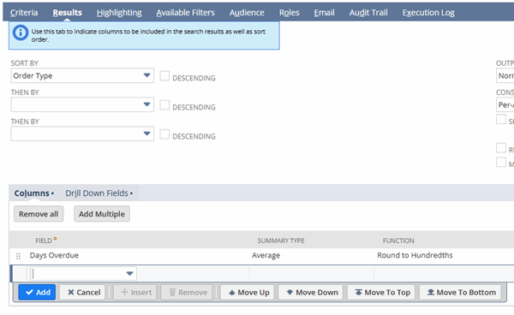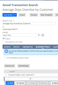 Each search returns a single value per customer and is linked to the customer record. To do this, create an available filter for Customer (Main Line) : Internal ID, which will link the transaction search back to the Customer for the non-stored field. Below are screenshots for the Average Days Overdue Saved Search.
