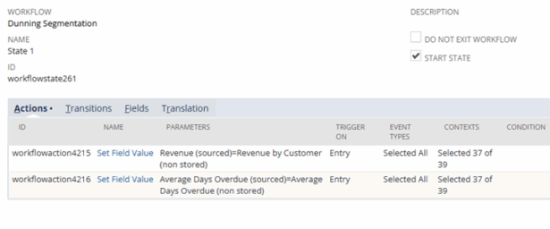 To make the calculated values usable in the Dunning module, two stored custom fields were created. A scheduled workflow was then configured to copy the values from the non-stored fields into the stored fields.
