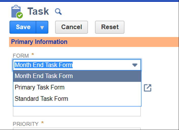First, we will create a custom form called Month End Tasks. The fields we will create will be displayed on this task form only.