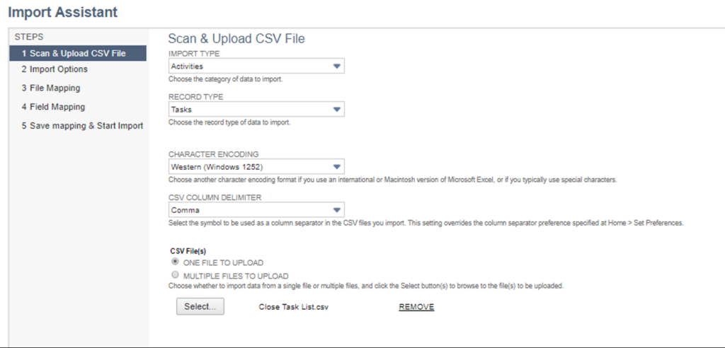 The Import Type will be to ‘Activities’ and Record Type is ‘Tasks’.