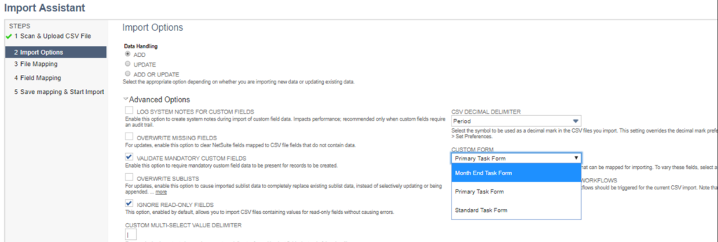 The Import Options will be ‘Add’ and the Advanced Options will need to be expanded to select the Month End Task Form as the Custom Form.