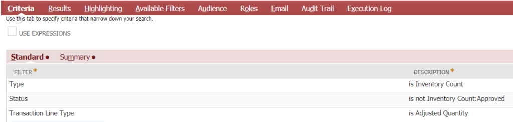 For the most streamlined process, start by creating the saved searches. The example we will be reviewing is a two-tier approval routing based on the value of the adjustment created from an inventory count. The challenge here is that the amount of an inventory item count is not a calculated field in NetSuite. This will be resolved using a saved search formula. The search will use a standard and summary criteria. The standard criteria uses the below information: