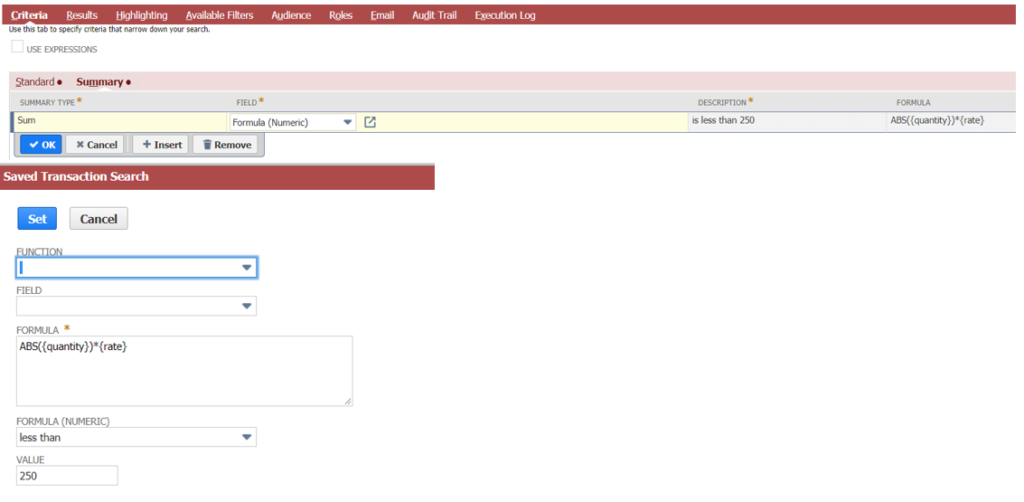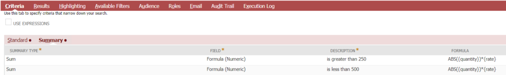 This criteria ensures we are getting unapproved inventory counts and their lines. The transaction line type criteria is important to ensure there are no unnecessary lines from header information. The summary criteria is how we will calculate the value of the adjustment. The formula ensures that the positive or negative adjustments for the defined amount are returned. If a single line or the entire count meets the criteria amount, the count will be returned. We will be using the results in the approval workflow discussed in later steps. Below is the summary criteria example for counts under $250: