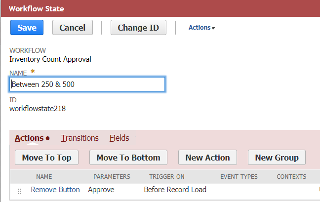 The final step is creating the Action “Remove Button” at each end state, and use the condition to set the approval routing criteria. There is no approval status field to be able to use other buttons and send the transaction to different states. The removal of the button is the way to use approval routing for a transaction that does not natively have that functionality.