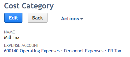- Identify a cost category name and a related Expense Account for the Landed Cost. (Note: You can create a Mill Tax Liability Clearing account to use for the cost category, if you do not want to use an expense account. The item receipt and bill will zero out any GL impact to the account selected on the Cost Category.)