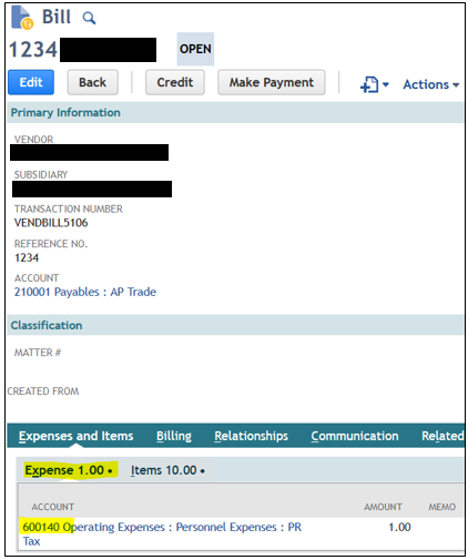 - The item will flow over to the Bill from the PO. In order to add the Landed Cost, navigate to the Expenses subtab and select the account tied to the Mill Tax Cost Category.
