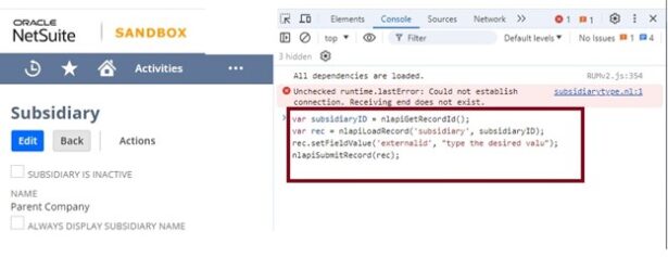 Here’s a nifty trick to update a subsidiary’s External ID in the user interface using the browser console (i.e.: Chrome + F12 key) Before we dive into the how…. let’s talk about the WHY!