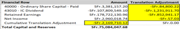 A custom Balance Sheet report will be generated which will show the respective subsidiary account balances that are contributing towards the CTA balance. In the example below, the following four accounts from the local entities were generating the CTA balance at consolidation.