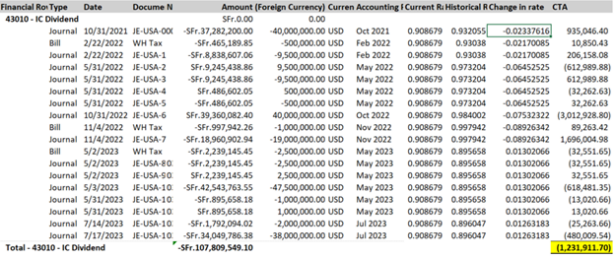 From the consolidated exchange rate table generated from the system obtain current and historical exchange rates. Calculate change in rate for each accounting periods and then multiply the change in rate with the original transaction amounts (foreign currency amount). CTA balance for each transaction can be calculated in this way. Notice that the total CTA balance generated from the account below is a net result of CTA balances for individual transactions.